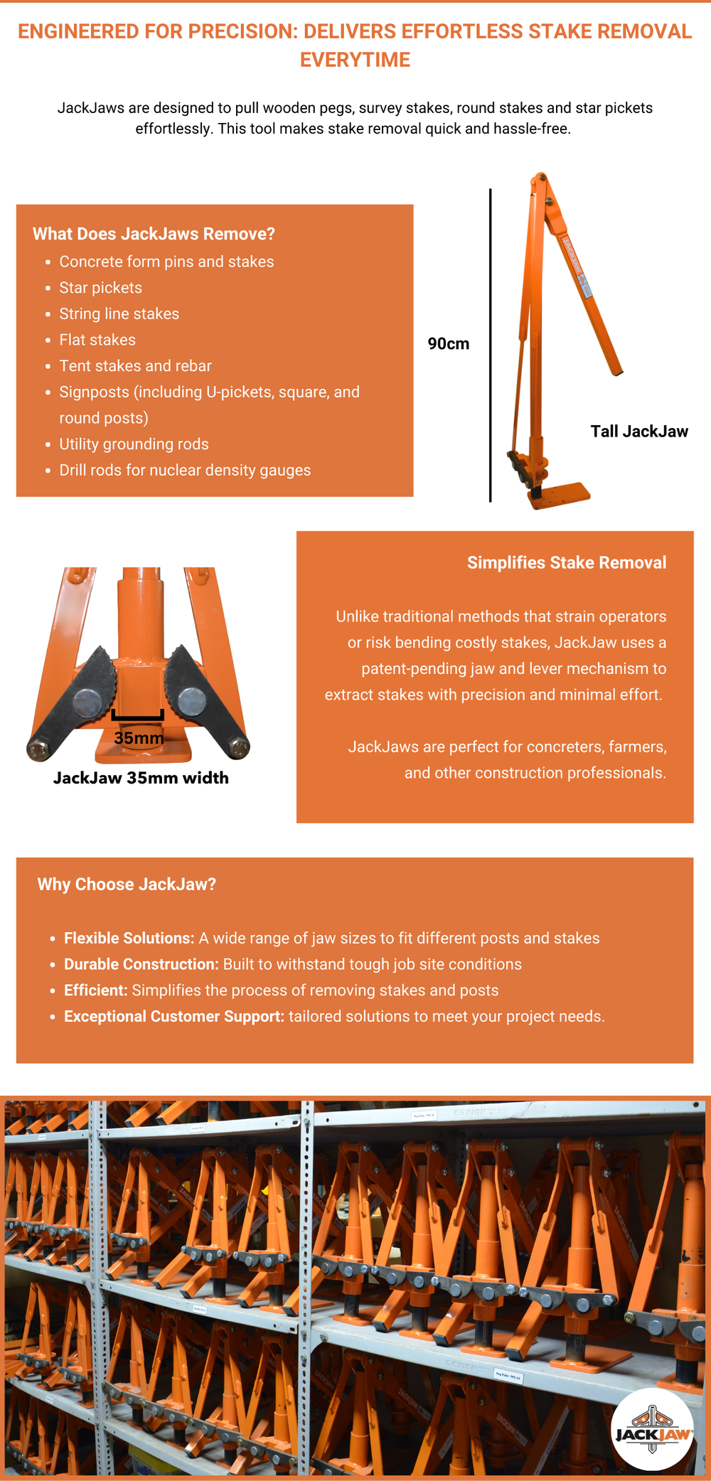 JackJaw pullers provide a quick and safe way to remove concrete form pins, star pickets, string line stakes, flat stakes, tent stakes, rebar, signposts (U, square, round), utility grounding rods, and drill rods for nuclear density gauges. Different jaw sizes are designed to fit a variety of stake and post dimensions, ensuring a secure grip and efficient removal across applications.