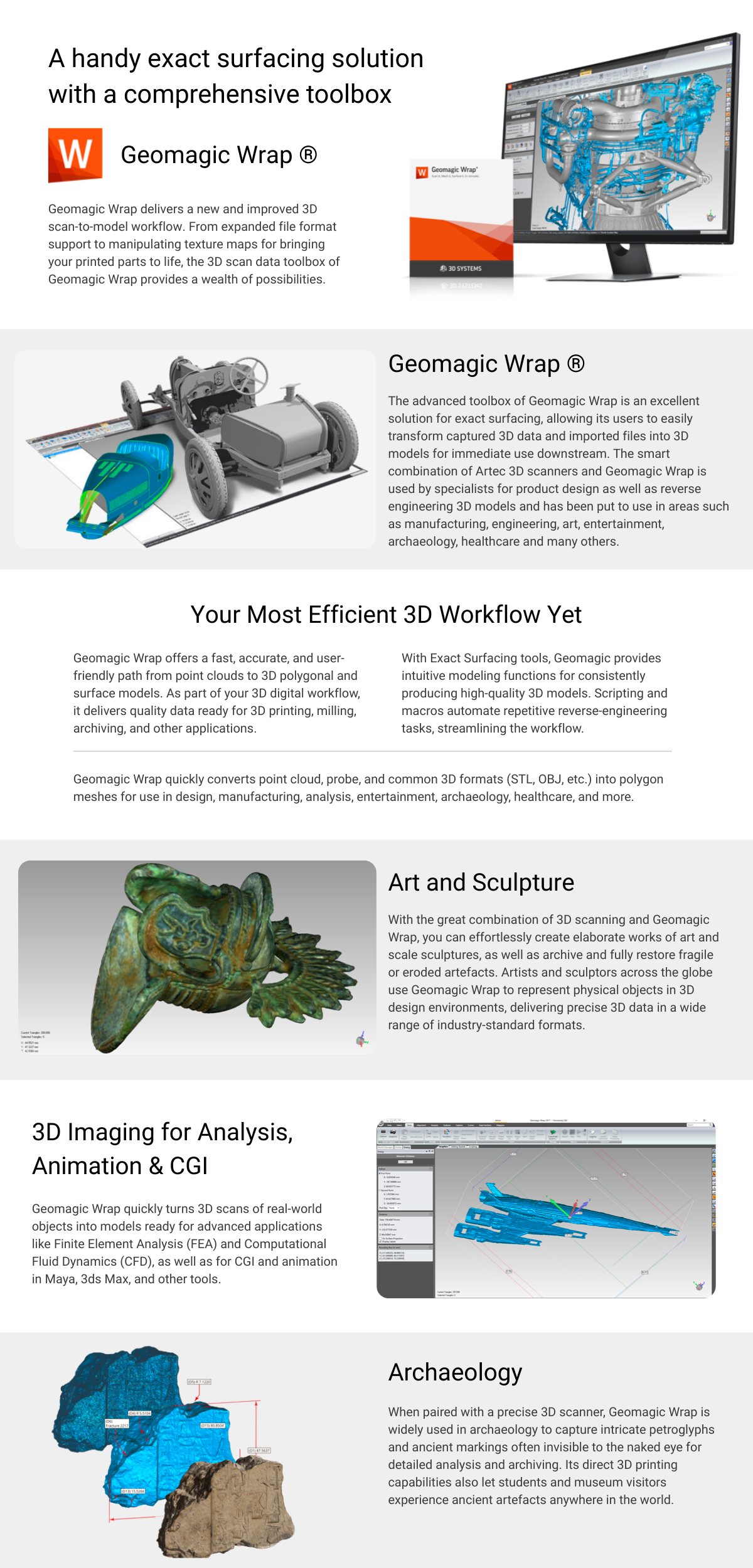 Geomagic Wrap Software With 1st year maintenance (Online Activation) Geomagic Wrap® delivers the most affordable, fast, accurate path from point clouds to 3D polygonal and surface models that you can use instantly in downstream engineering, manufacturing, art, industrial design, and more. As part of your 3D digital thread, Geomagic Wrap provides the digital bridge for creating perfect data to use directly in 3D printing, milling, archiving, and other 3D uses. With advanced exact surfacing tools, Geomagic Wrap delivers powerful, easy-to-use, cutting-edge modeling functions for that flawless 3D model. Scripting and macros also automate functions for repetitive tasks during the reverse-engineering process. Geomagic Wrap enables you to transform point cloud data, probe data, and imported 3D formats like STL and OBJ into 3D polygon meshes for use in manufacturing, analysis, design, entertainment, and archeology.