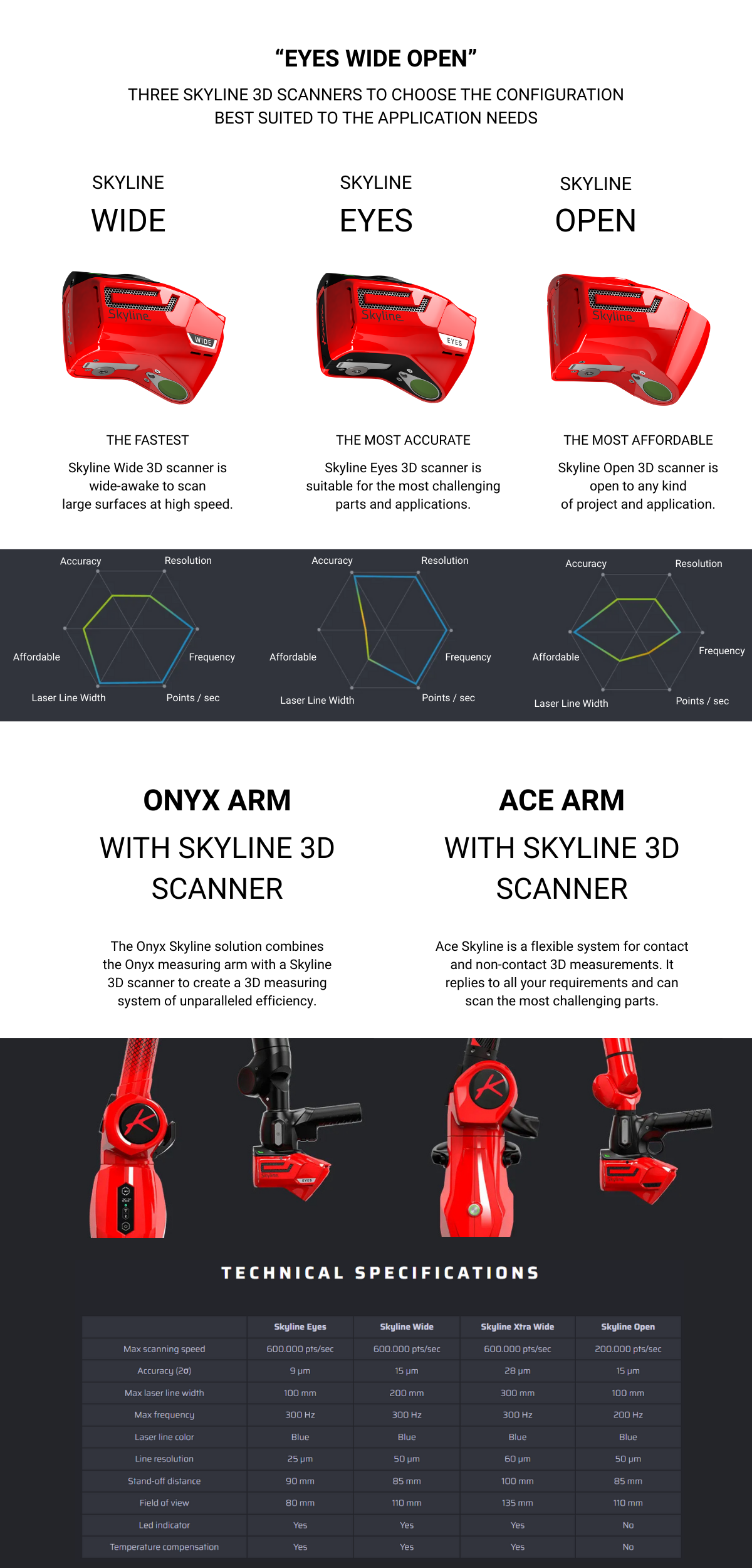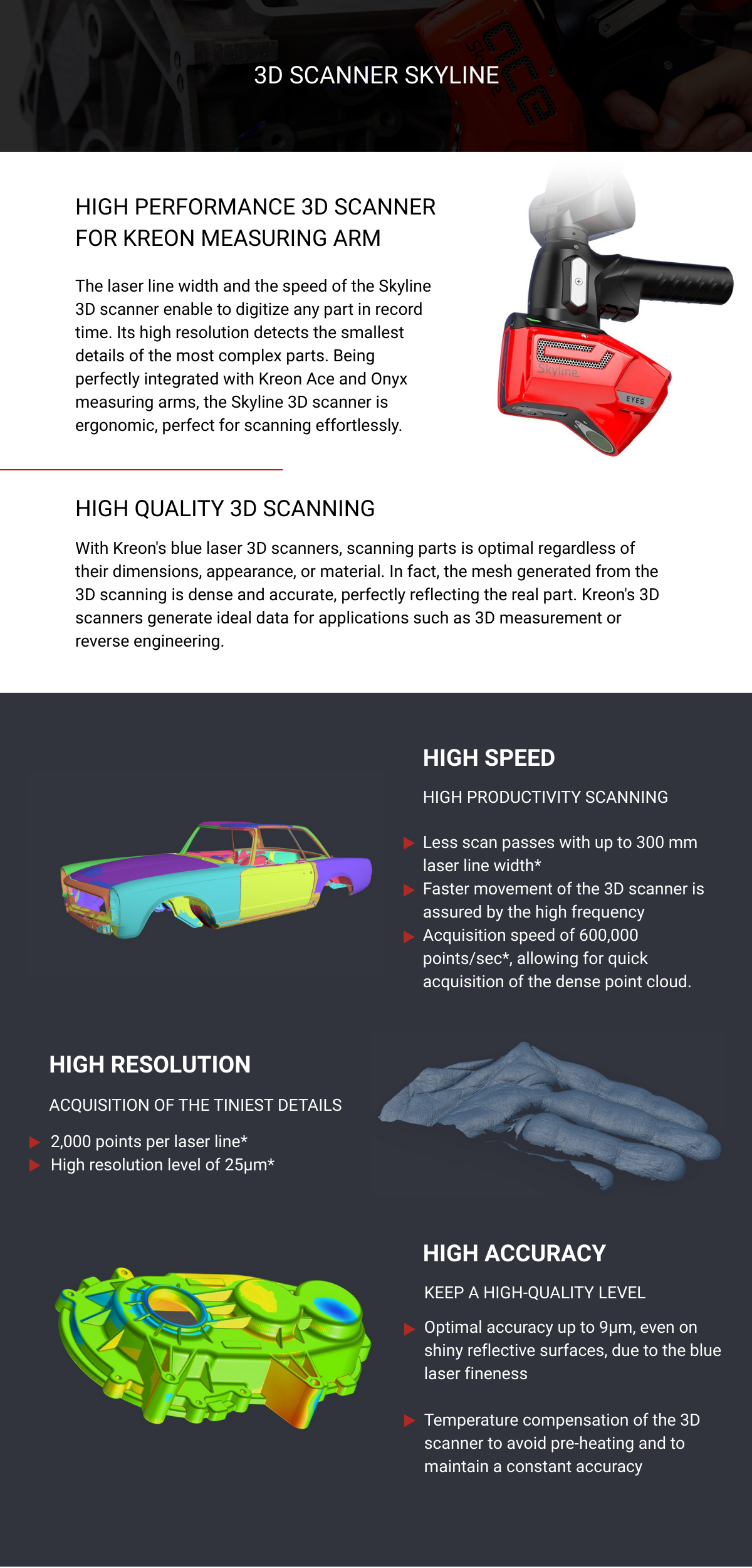 Kreon Skyline OPEN scanner Skyline is the only Kreon scanners range fully integrated to Ace 7 axis measuring arm. The laser line width and the speed of the Skyline 3D scanner enable to digitize any part in record time. Its high resolution detects the smallest details of the most complex parts. Being perfectly integrated with Ace measuring arm, the Skyline 3D scanner is ergonomic, perfect for scanning effortlessly.