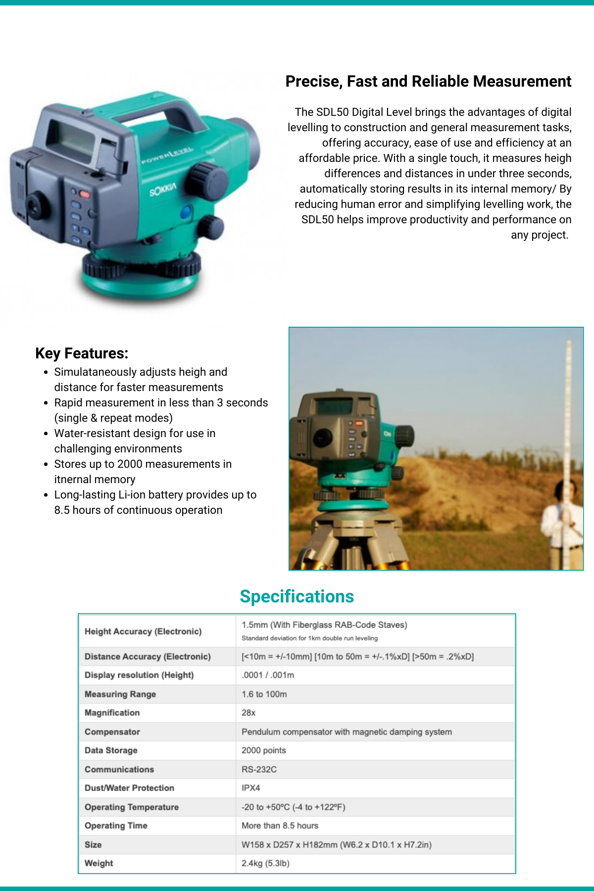 SOKKIA SDL50 DIGITAL LEVEL Easy, accurate measurement for construction and general applications. Sokkia brings the benefits of digital leveling to construction applications at an affordable price with the reliable, easy-to-use SDL50 Digital Level. In less than 3 seconds and with the touch of a key, height difference and distance can be measured and the result is stored in internal memory. The SDL50 minimizes human error and maximizes the ease of leveling work, allowing increased productivity and performance. Key SDL50 features include: Adjusts height and distance simultaneously Measurement is less than 3 seconds (single & repeat modes) Water resistant 2000-point internal memory Li-ion power system for up to 8.5 hours of continuous operation