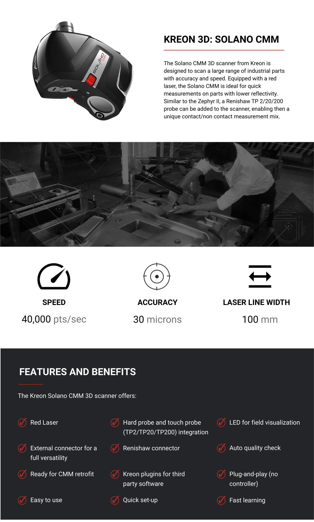 The Solano CMM 3D scanner is equipped with a red laser and enables to scan most of industrial parts with a good accuracy and a high scanning speed. Moreover, like Zephyr II range of products, a Renishaw TP 2/20/200 probe can be added to the scanner, enabling then a unique contact/non contact measurement mix.