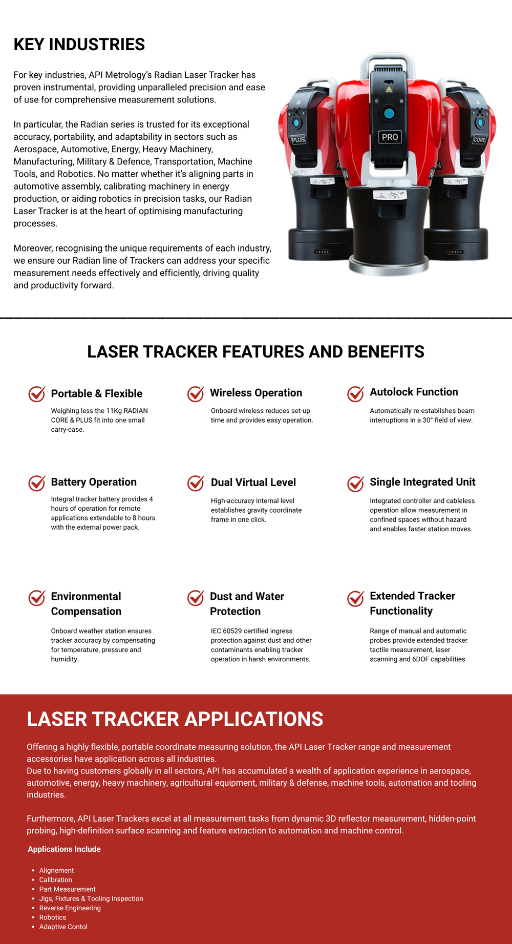 The API Radian Pro 3D Laser Tracker is the most advanced model in the Radian series, offering exceptional 3D measurement capabilities for industries that require the highest level of precision and performance. With a range of up to 80 meters and an industry-leading accuracy of 0.7 µm per meter, the Radian Pro provides unparalleled measurement flexibility. It supports both 3D and 6D tracking, making it ideal for complex alignment, calibration, and inspection tasks in aerospace, automotive, and manufacturing applications.