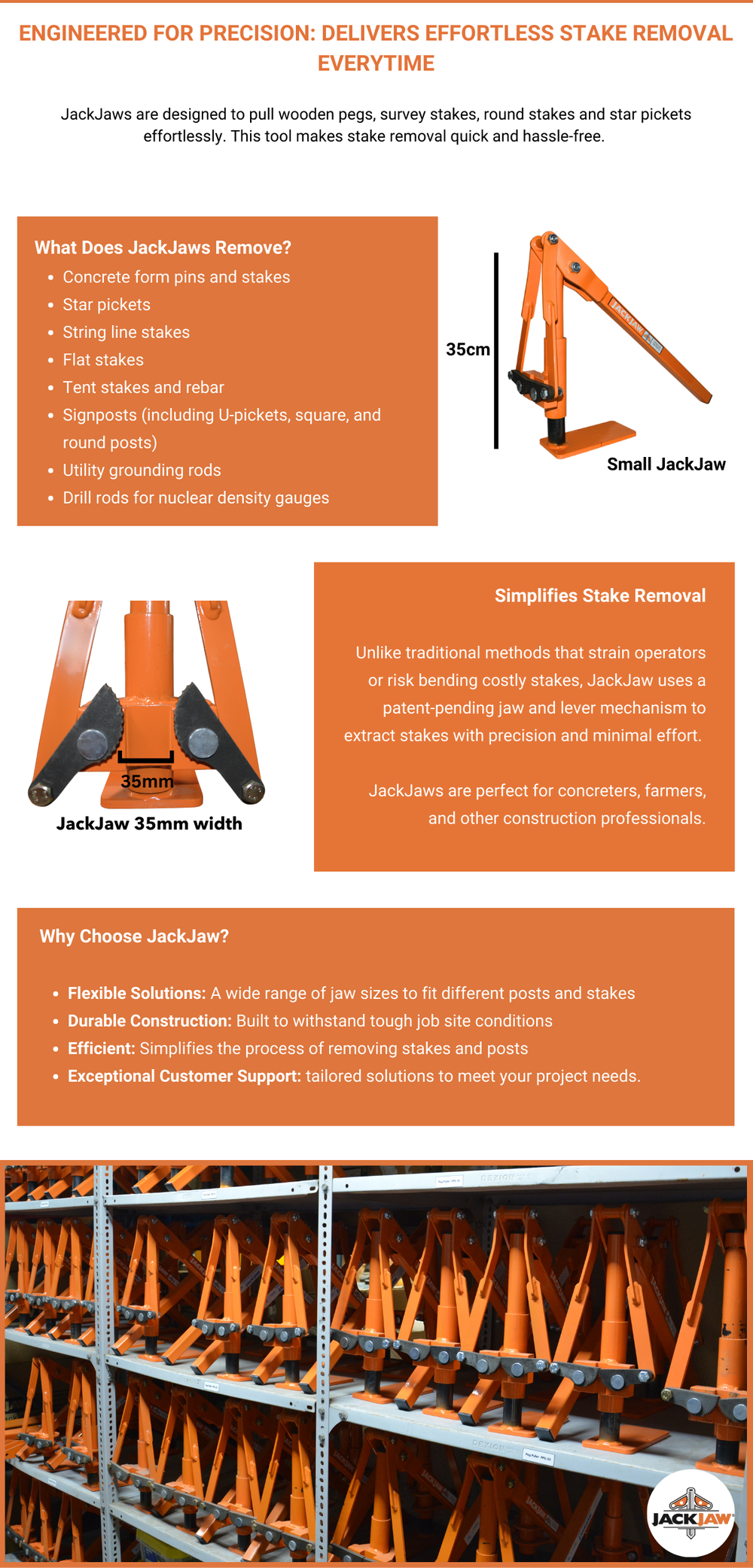 JackJaw pullers provide a quick and safe way to remove concrete form pins, star pickets, string line stakes, flat stakes, tent stakes, rebar, signposts (U, square, round), utility grounding rods, and drill rods for nuclear density gauges. Different jaw sizes are designed to fit a variety of stake and post dimensions, ensuring a secure grip and efficient removal across applications.