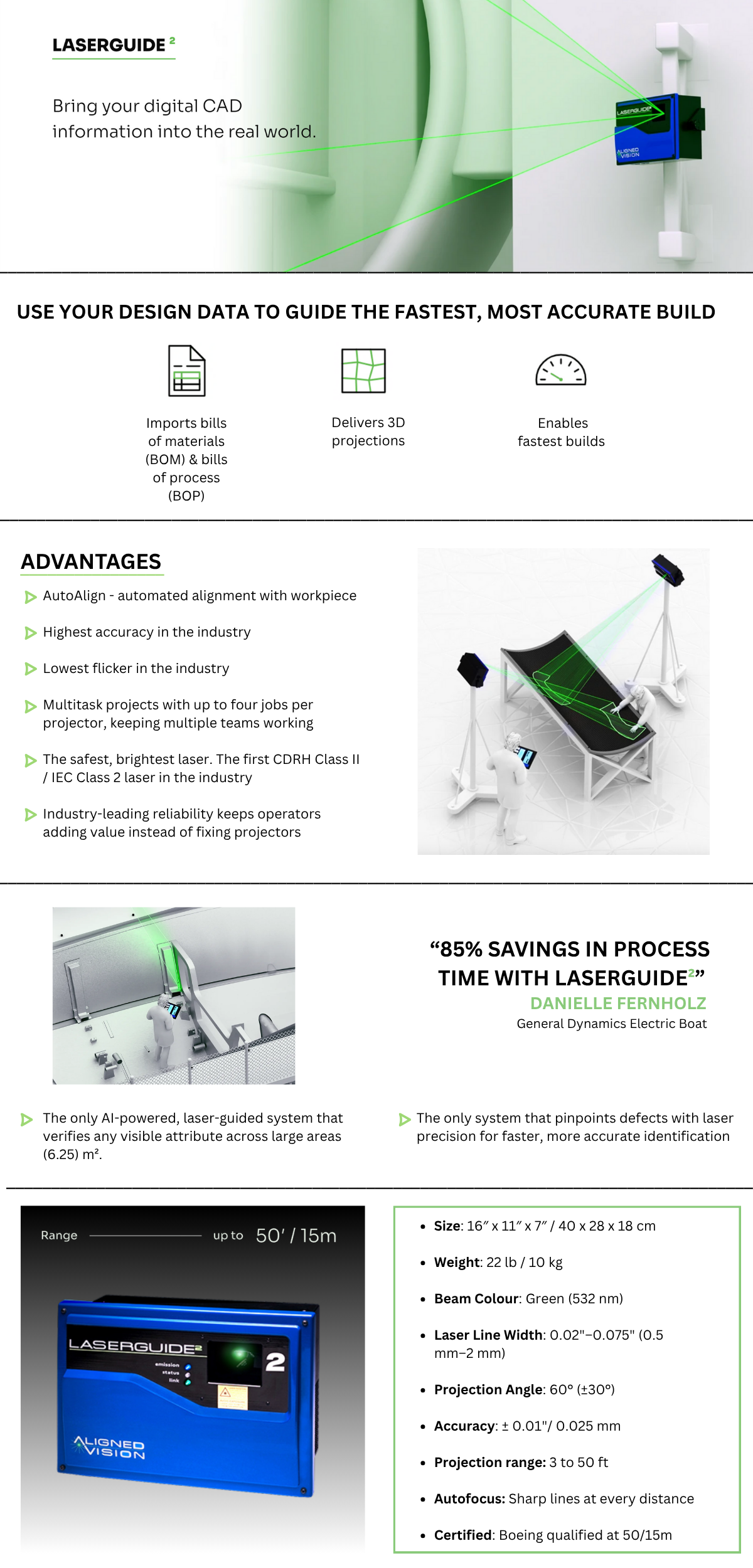 Incorporating the latest advancements in lasers, galvanometers, optics, temperature stabilization, and computing, LASERGUIDE2 delivers precise 3D industrial laser projections. It meets laser templating and other guidance needs with industry-leading reliability.