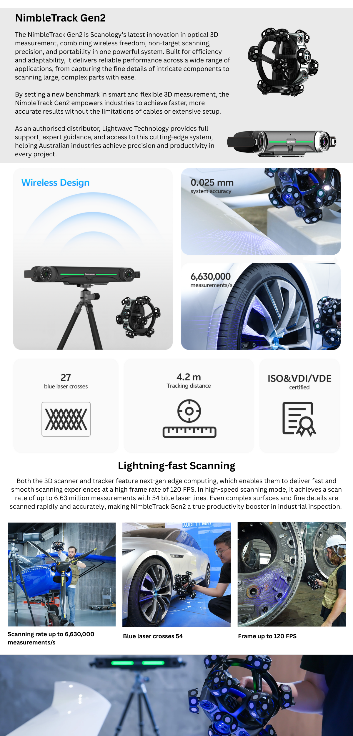 NimbleTrack Gen2 is Scanology’s next-generation wireless optical 3D scanning system, designed to deliver true freedom and precision in measurement. With wireless connectivity and marker-free scanning, it combines portability, speed, and accuracy in one powerful device. From intricate components to large-scale assemblies, NimbleTrack Gen2 adapts seamlessly to any part size, offering high efficiency and smart operation for diverse applications. Setting a new benchmark in 3D metrology, it empowers users with faster, more versatile, and reliable measurement anytime, anywhere.