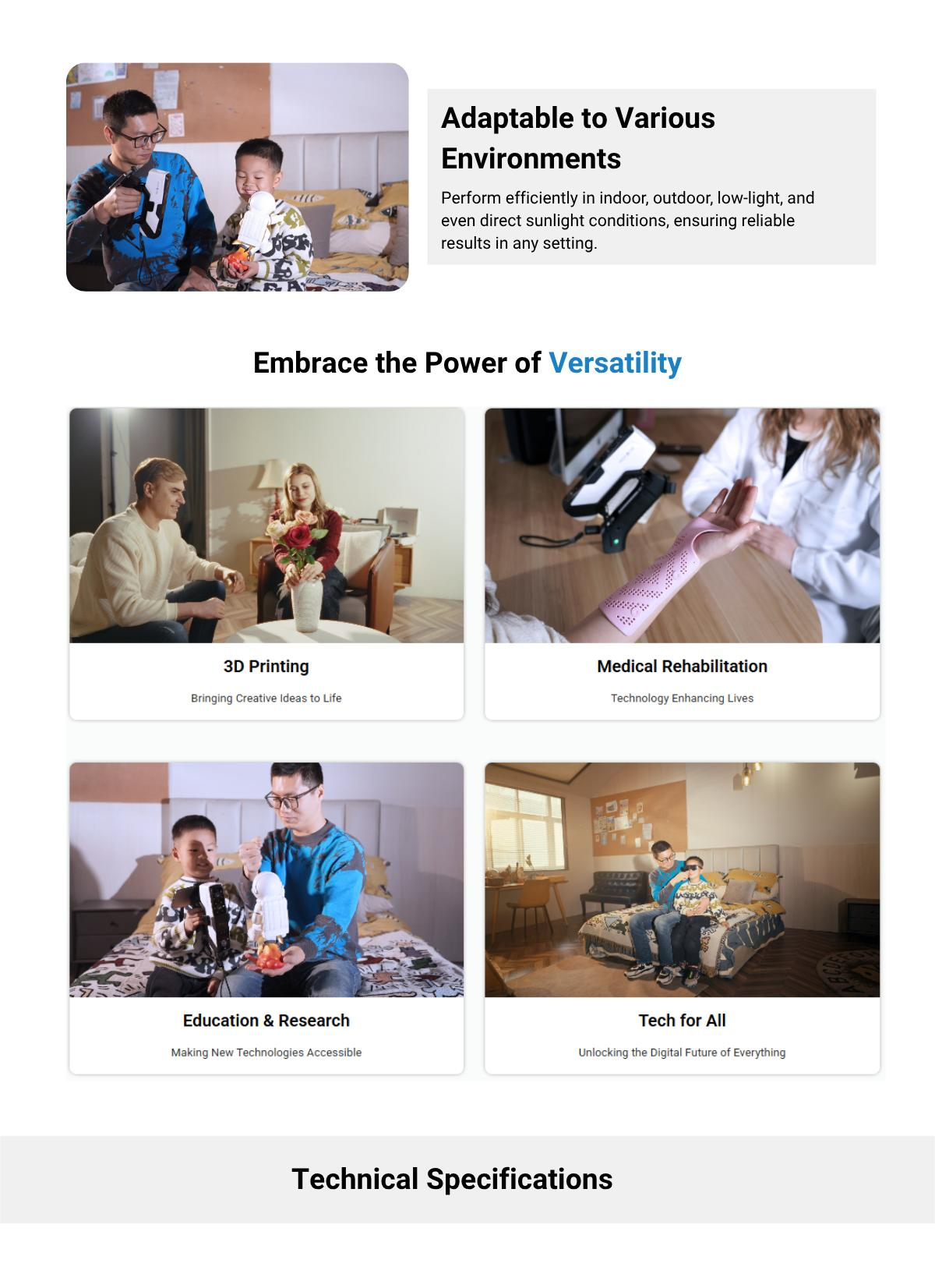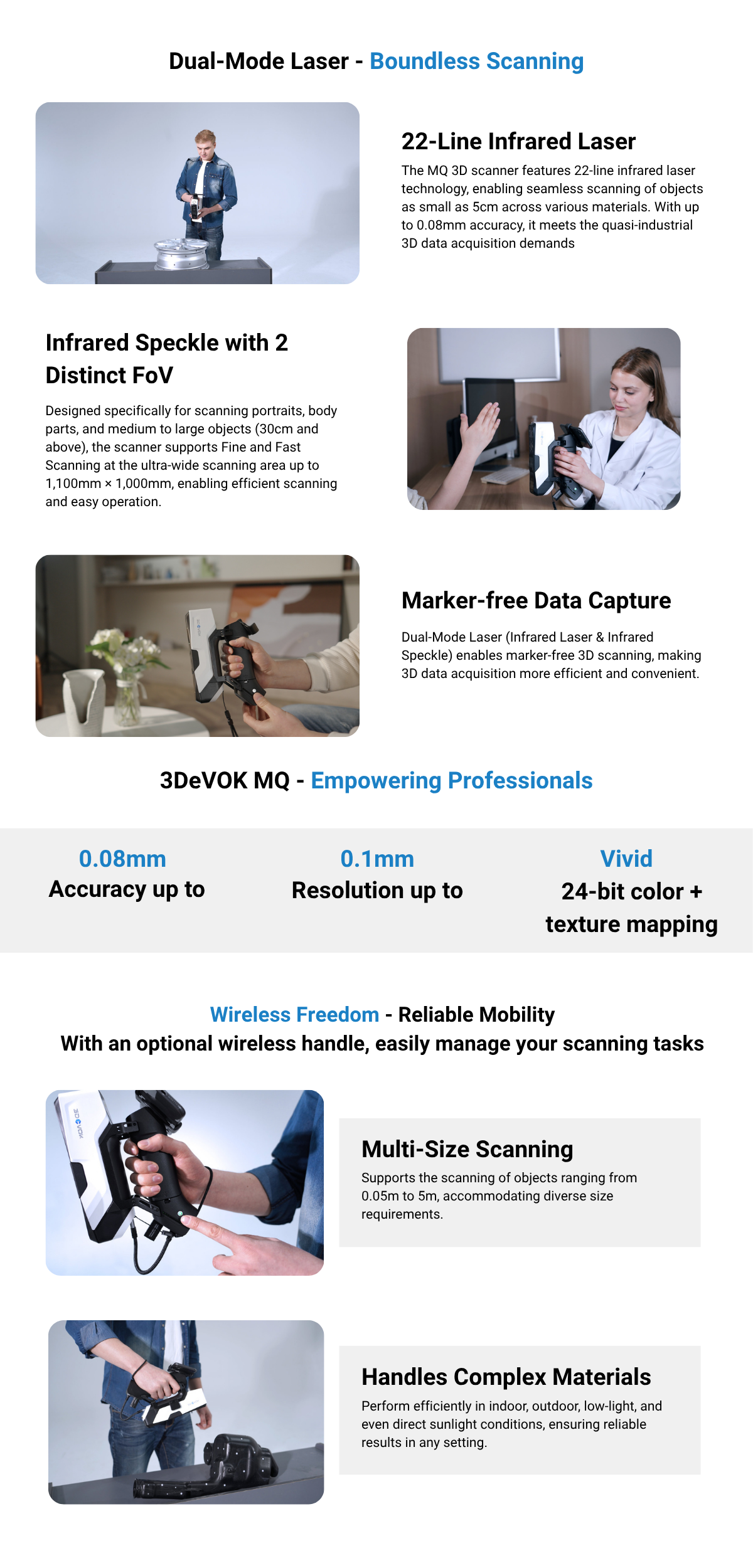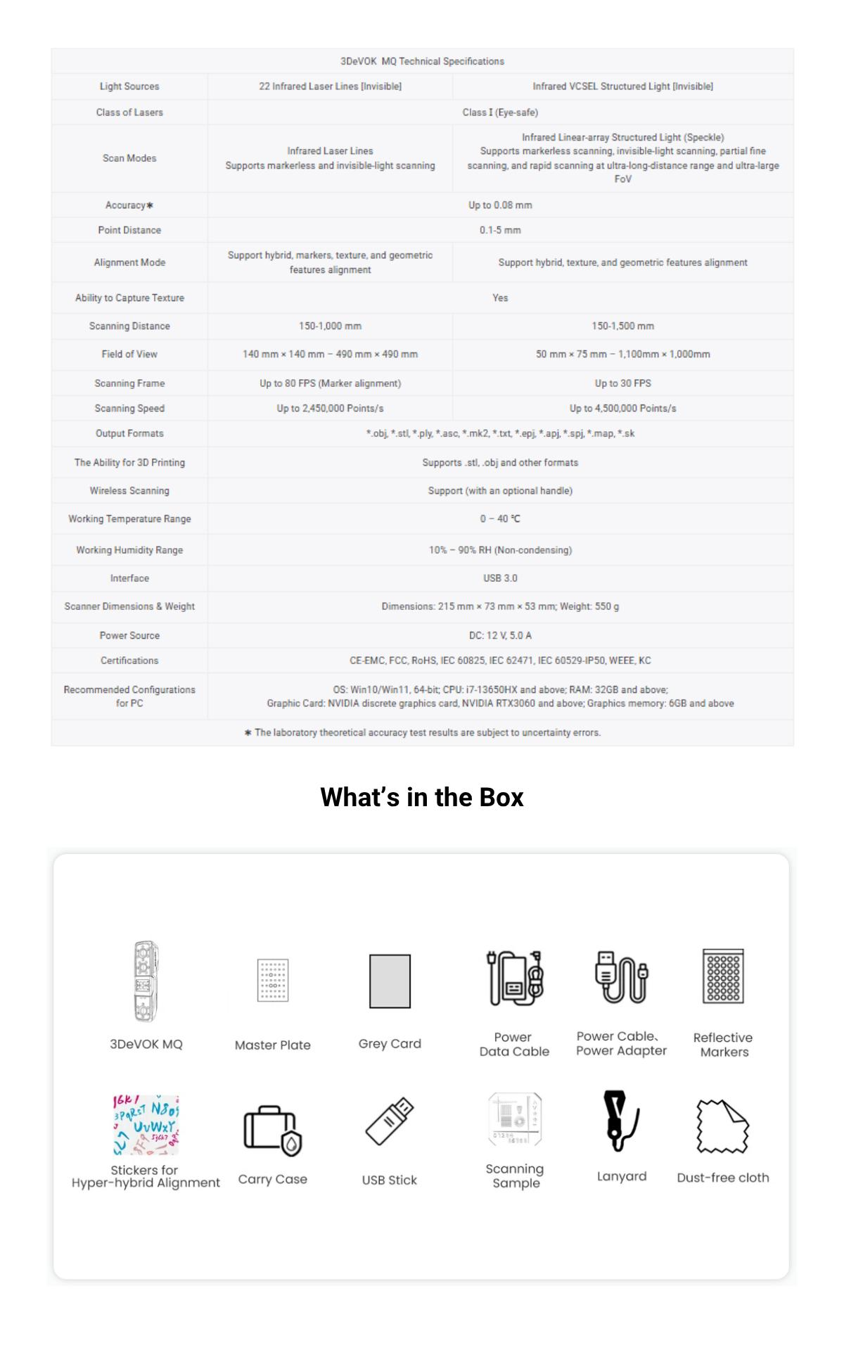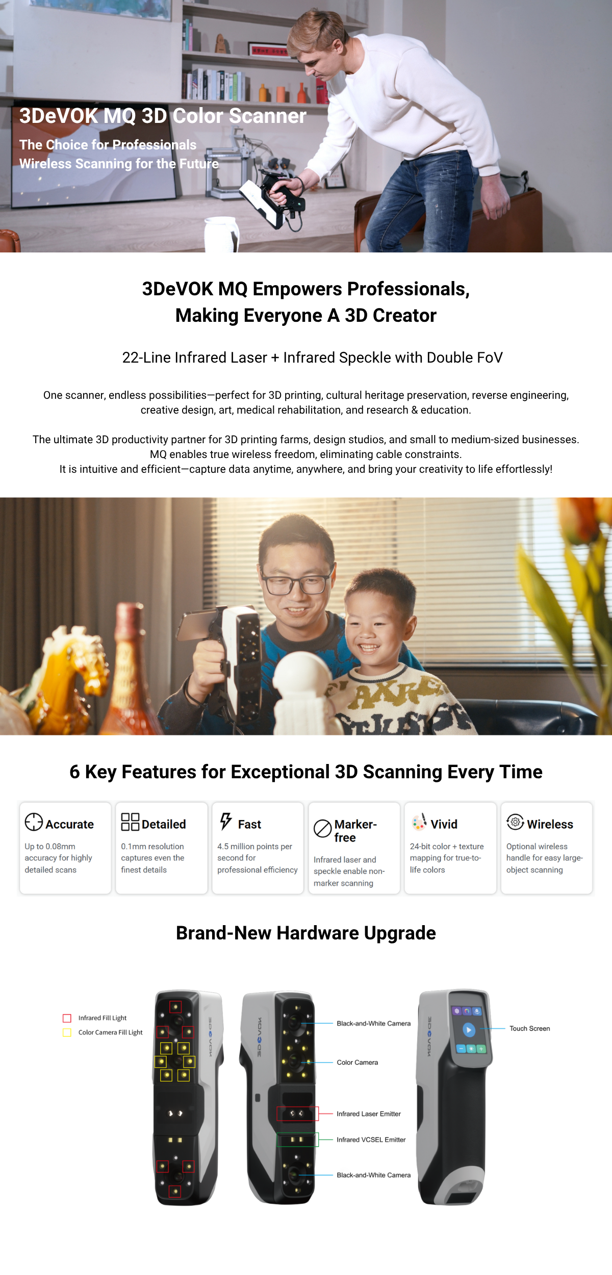 3DeVOK MQ Professional 3D Scanner empowers professionals and creators alike, redefining accessibility in 3D scanning. Equipped with 22-line infrared laser and infrared speckle technology with dual field of view, MQ offers remarkable precision and flexibility across diverse applications—including 3D printing, cultural heritage preservation, reverse engineering, creative design, art, medical rehabilitation, and education. Designed for true wireless operation, MQ frees users from cable constraints, enabling seamless data capture anytime, anywhere. With its intuitive interface and efficient workflow, MQ transforms complex 3D scanning into an effortless, creative experience—making everyone a true 3D creator.